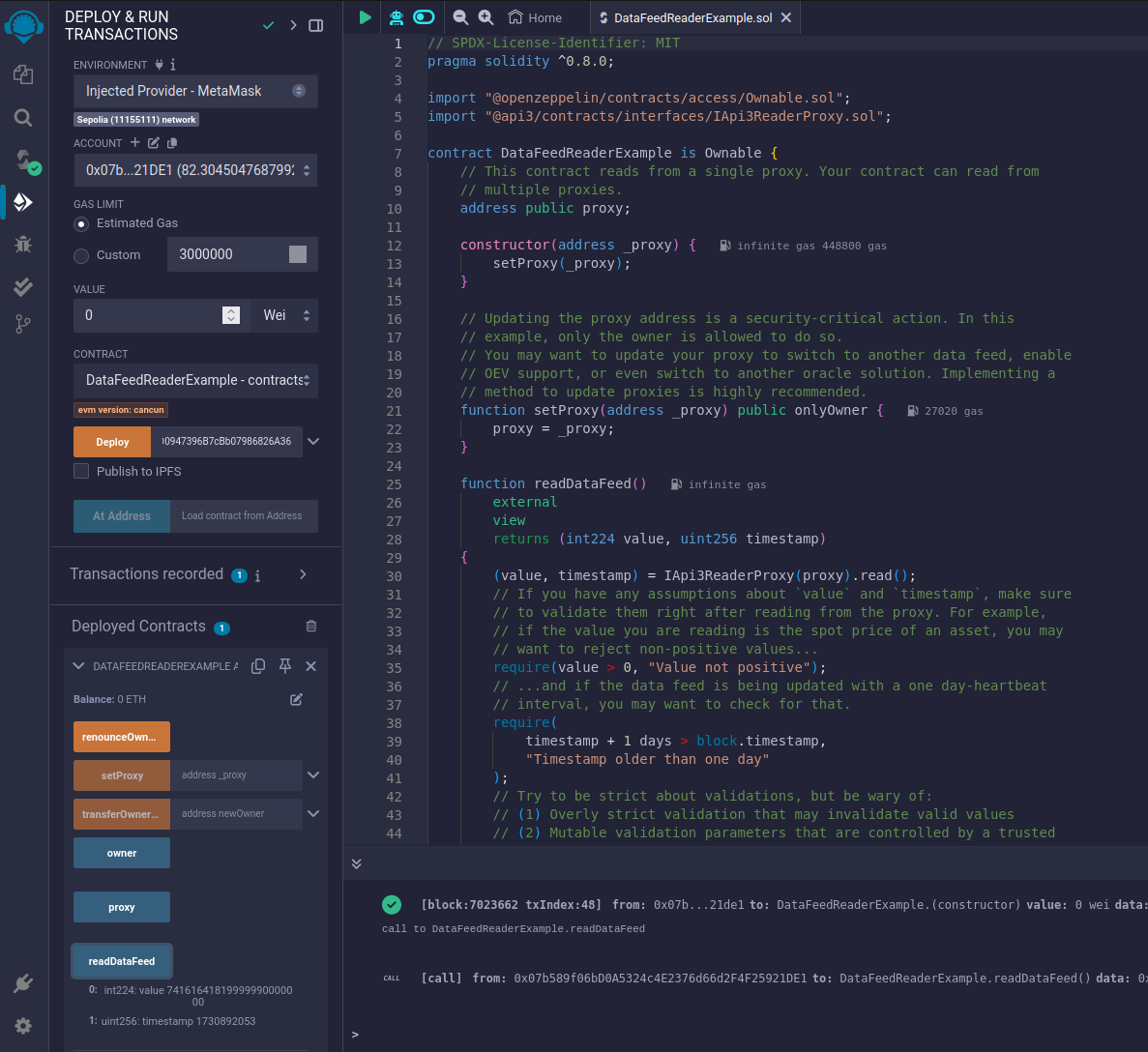 After the transaction is confirmed, you can call the publicly accessible functions of DataFeedReaderExample. Under "Deployed Contracts", expand 'DATAFEEDREADEREXAMPLE AT ...', then click "readDataFeed". You'll see the values that DataFeedReaderExample reads from Api3ReaderProxyV1.